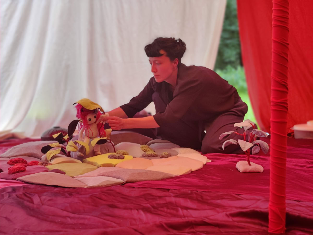 « Au son du violoncelle, commence une balade sensorielle et poétique dans les bois. Au coin d’un arbre ou d’une feuille, nous y rencontrons cerf, coccinelle, renard, papillon et autres habitants. Les dimensions se mélangent, le minuscule devient géant, le vent nous emporte alors nous chantons et l’enfant est invité dans une bulle imaginaire que nous explorons en douceur. »